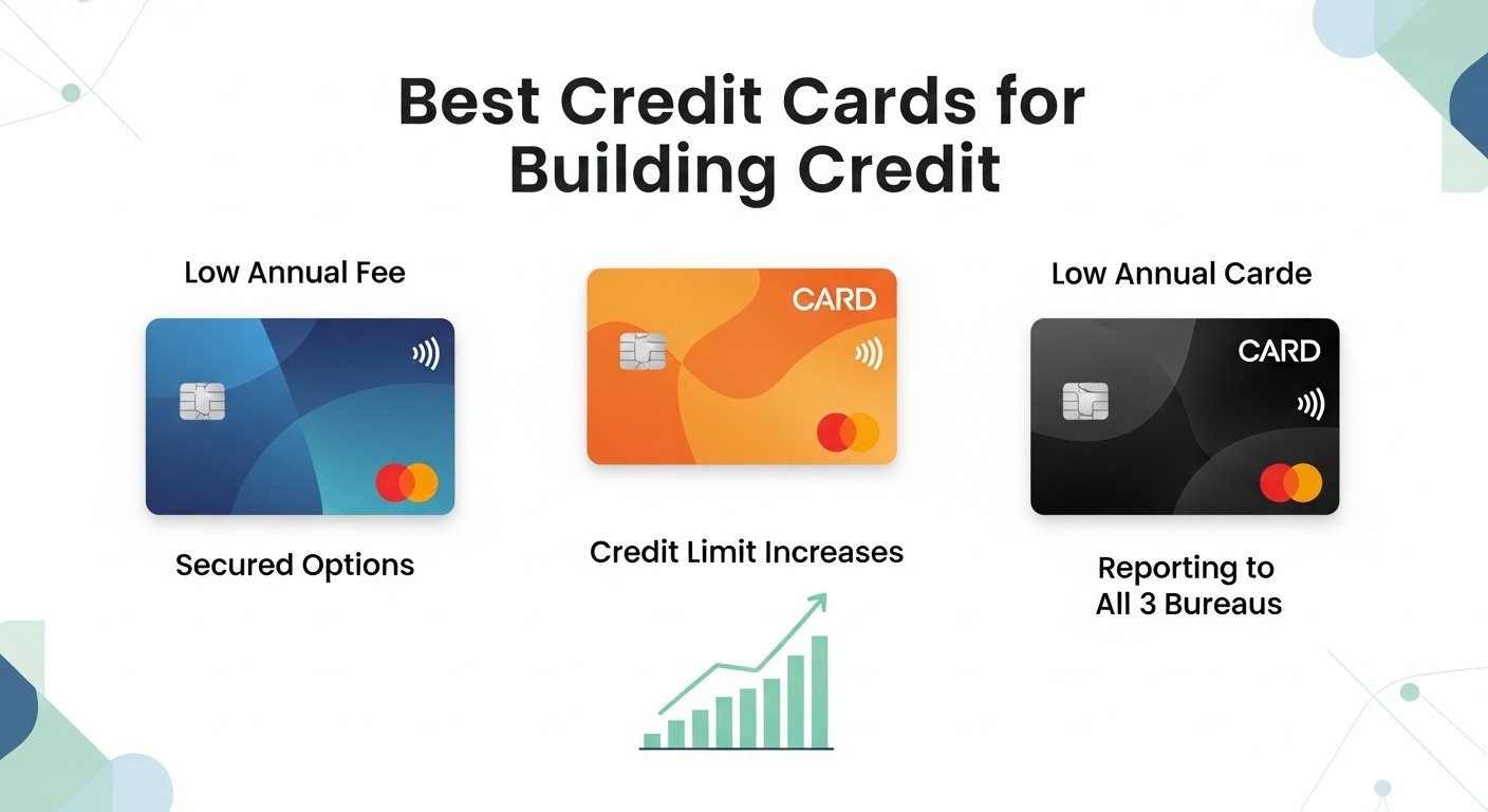 Secured credit cards are best for building credit from scratch. Student cards work well for college students. Look for cards that report to all three credit bureaus. Choose cards with low or no annual fees.