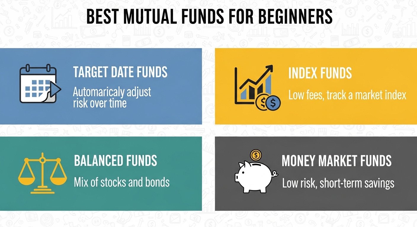 Index funds are best for beginners due to low costs and diversification. Target-date funds offer automatic rebalancing. Look for funds with expense ratios below 0.20%. Choose funds from reputable companies like Vanguard or Fidelity.